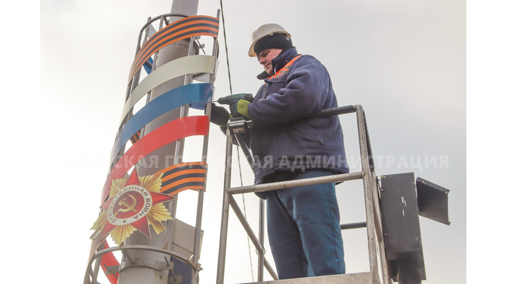 Работает бригада из четырёх человек. В течение недели ремонт консолей на проспекте Героев будет завершен. До Дня Победы покрасят мачты освещения, на которых размещены инсталляции.